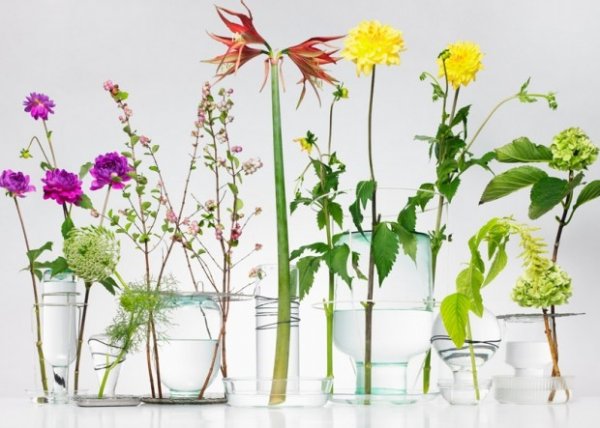 В итоге были получены вазы, напоминающие поилки для птиц – керамический или стеклянный контейнер удерживается при помощи металлического каркаса, и в итоге на поддоне будет совсем мало жидкости, которая добавляется по мере высыхания или потребления её цветами. Сами цветы скрывают ёмкость, которая находится в середине конструкции.